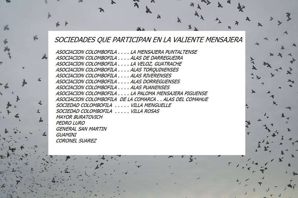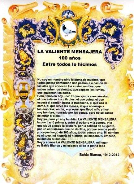 La Asociación Colombofilia la Valiente Mensajera BAHIA BLANCA-BUENOS AIRES-ARGENTINA, nació un día de reyes de 1912 en la cual el núcleo fundacional lo vinculaba una misma pasión, la que todavía existe: la de los amaneceres junto a los palomares, el perder sus miradas en el cielo, velar los nidos de las reproductoras y emocionarse con la llegada de cada vuelo.