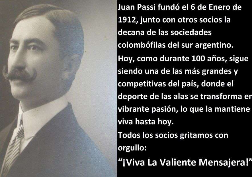 Sus Primeras Palomas Las trajo el señor Juan Passi de Bélgica y se trató de un casal de Hansennes y un casal Groothers. El primero estaba compuesto por una hembra escamada, talla mediana, ojos colorados, anillo 5.074 del año 1911, y un macho oscuro terciopelo tapado, ojos naranjas, anillo 6.003 del año 1910. Por su parte el casal de Groothers lo integraban un macho overo escamado de gran talla y una hembra oscura pintas blancas mediana.Posteriormente fueron incorporados los primeros ejemplares de raza Veggue del palomar del Dr Posadas de Buenos Aires, en 1915.Un año después Passi adquirió en la metrópoli el primer casal de Vanschingen al señor Alfredo Pozzi. Se trató de un casal de colorados alas blancas y otro de Groothers, escamados oscuros de poca talla, chispas blancas en la cabeza. Estos ejemplares fueron la base de los mejores planteles que se cultivaron en Bahía Blanca y aun, hoy día siguen siendo la base de muchos palomares donde se aprecia la descendencia, con características innatas de grandes voladoras de fondo, sin desmerecer por su puesto otras grandes palomas incorporadas en años posteriores desde Buenos Aires e inclusive desde España, Bélgica y Alemania, que sirvieron con las existentes para elevar la cantidad y calidad de los planteles que existen en la actualidad.