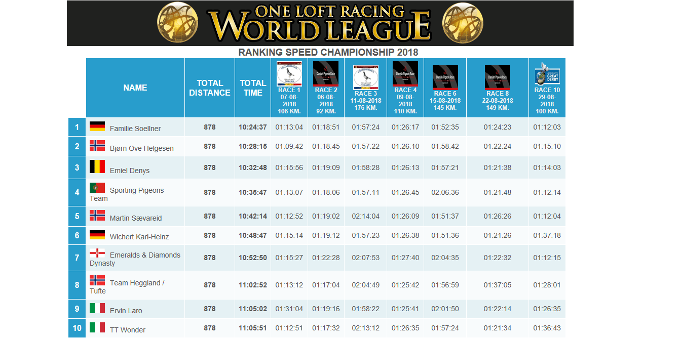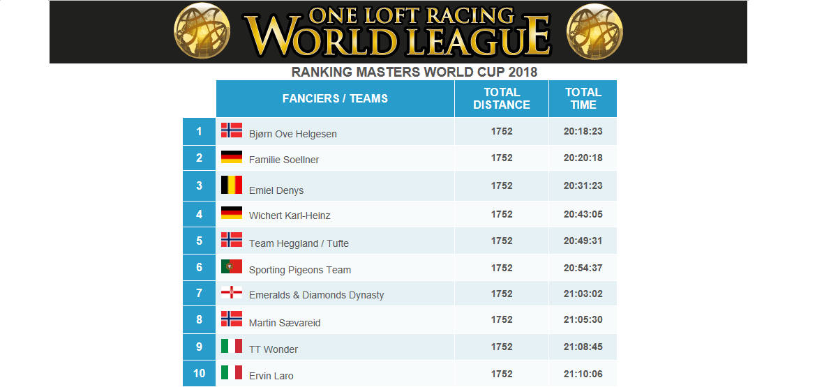 RACE 10. MASTERS WORLD DIVISION. ONE LOFT RACING WORLD LEAGUE