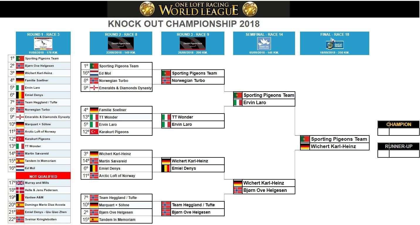 The Masters World Division 2018 thirteenth race: Derby del Mediterraneo. 05/09/2018. 146 km. was Knock Out Championship 2018 Semifinal. Sporting Pigeons Team (Portugal) and Wichert Karl-Heinz (Germany) won their confrontations and will be the finalists of Knock Out Championship 2018, so we will have a great final with two top world fanciers/teams known and recognized in the racing pigeons world and one loft races around the world. The final will be in the Race 18 of Masters World Division; in Algarve Great Derby 19/09/2018. 250 km.KNOCK-OUT Championship 2018
