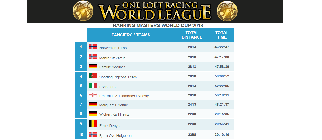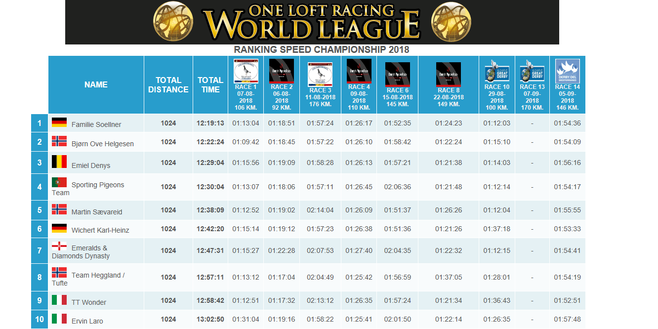 The next race will be: Algarve Great Derby. 07/09/2018. 170 km. Hot Spot Championship 2018 SEMIFINAL: There are 3 fanciers/teams; Team Heggland/Tufte (Norway), Emiel Denys (Belgium) and Familie Soellner (Germany), the first 2 teams will be qualified and 1 will be not qualified. It is scoring race for Masters World Cup (Main competition), as all 21 races, and scoring race for Speed Championship 2018.