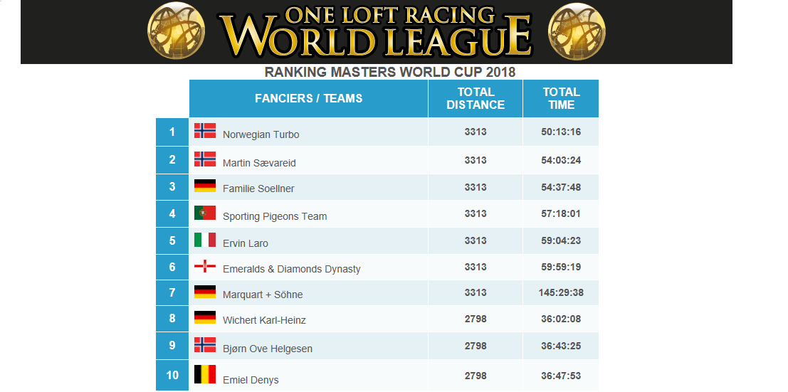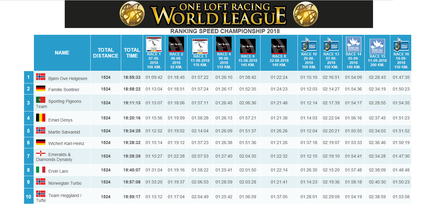 Bjørn Ove Helgesen (Norway) is the Speed Championship 2018 CHAMPION of Masters World Division; Top World Divison of One Loft Racing World League. We want to remind, Bjorn Ove Helgesen was Runner Up in Speed Championship 2017 Final Ranking, so we see that he is a top world fancier in the specialty of speed.