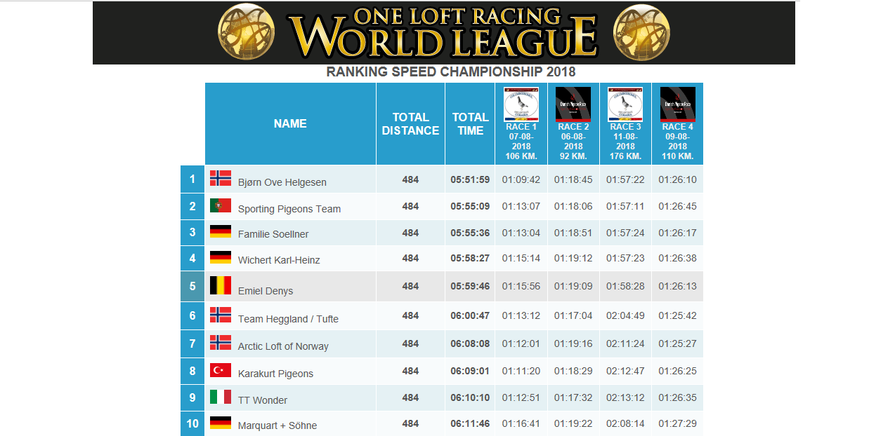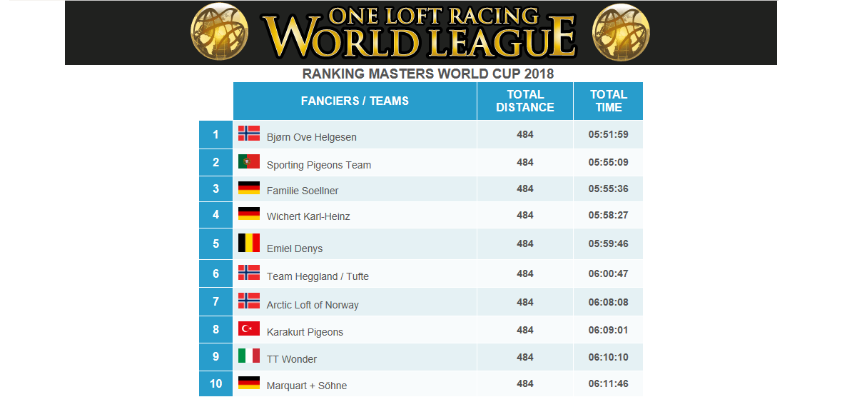 Bjorn Ove Helgesen was 2nd placed of the Masters World Division participants in this race, with this result Bjorn Ove Helgesen (Norway) maintains the leadership of Masters World Cup 2018 (Main competition of Masters World Division) after 4 of 21 races and Sporting Pigeons Team (Portugal) has managed to be the current 2nd Placed, we want to remind, Sporting Pigeons Team was Runner Up in Masters World Cup 2017 Final Ranking.