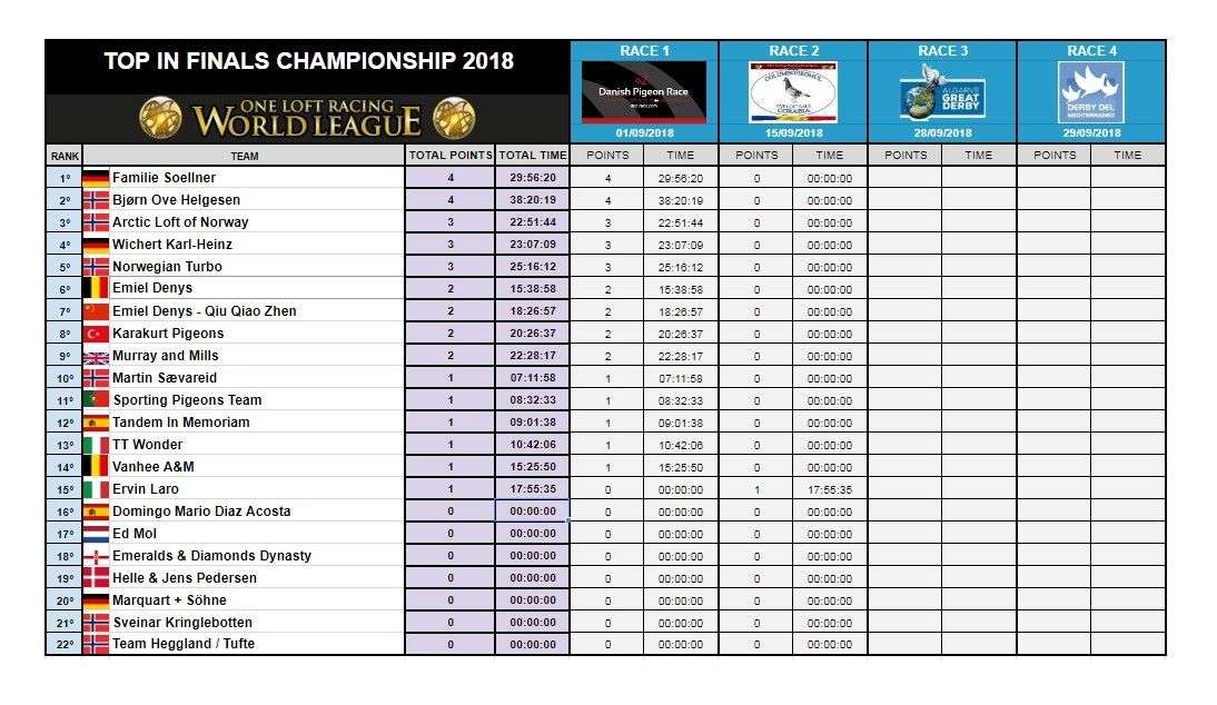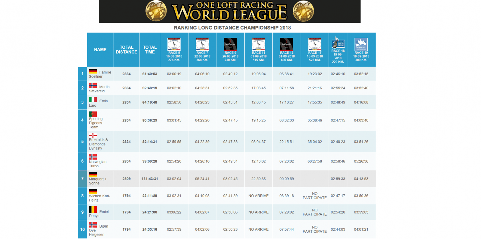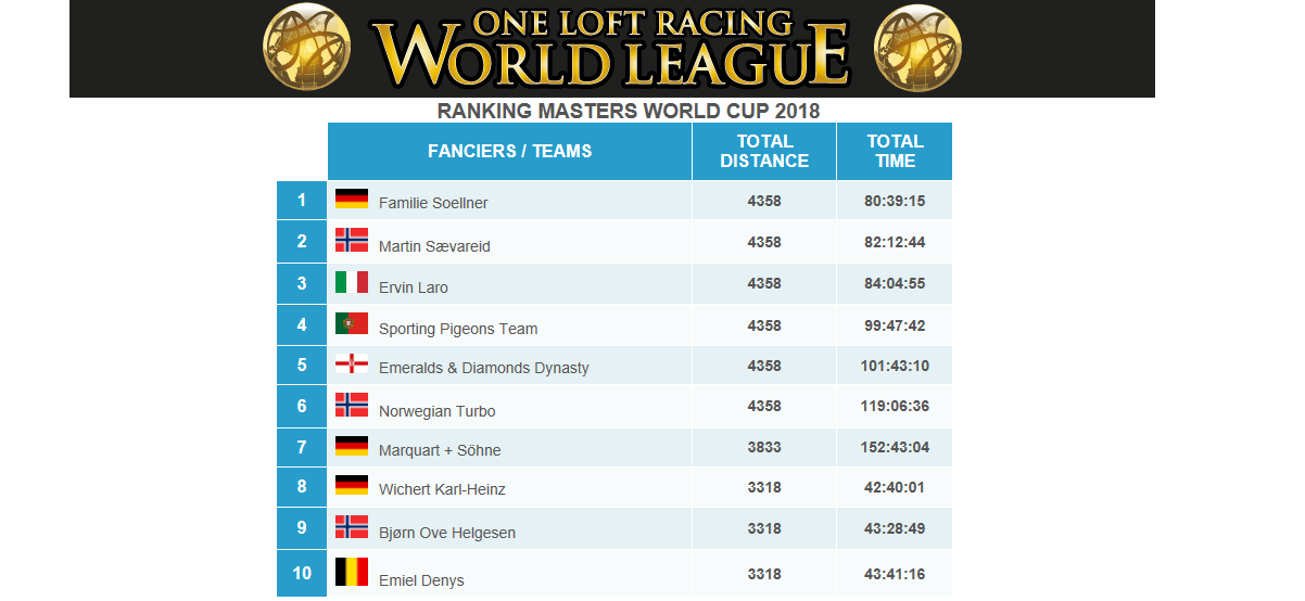 In the Masters World Cup 2018 (Main competition) there are 6 participants who have received pigeons in the all 19 scoring races (4.358 km) of the Masters World Divison 2018, so they are the favorites to win Masters World Cup 2018. The provisional leader is Familie Soellner (Germany) who has two close pursuers; Martin Sævareid (Norway) to 1:33:29 and Ervin Laro (Italy), the Masters World Cup 2017 Champion, to 3:25:40. A little further there are two other competitors; Sporting Pigeons Team (Portugal) to 19:08:27 and Emeralds & Diamonds Dynasty (Northern Ireland) to 21:03:55. Finally, Norwegian Turbo (Norway) is to 38:27:21. Therefore, the first positions of the ranking, and of course the champion, of the Masters World Cup 2018 are to be decided as there are two final races ahead with a total of 938 km. In the rest of the ranking sure there will be changes also to know the top ten and the last positions. The situation of the Long Distance championship 2018 is similar to that of the Masters World Cup 2018 and in the Top in Finals championship 2018 there is still everything to decide. You can see the ranking situations below.