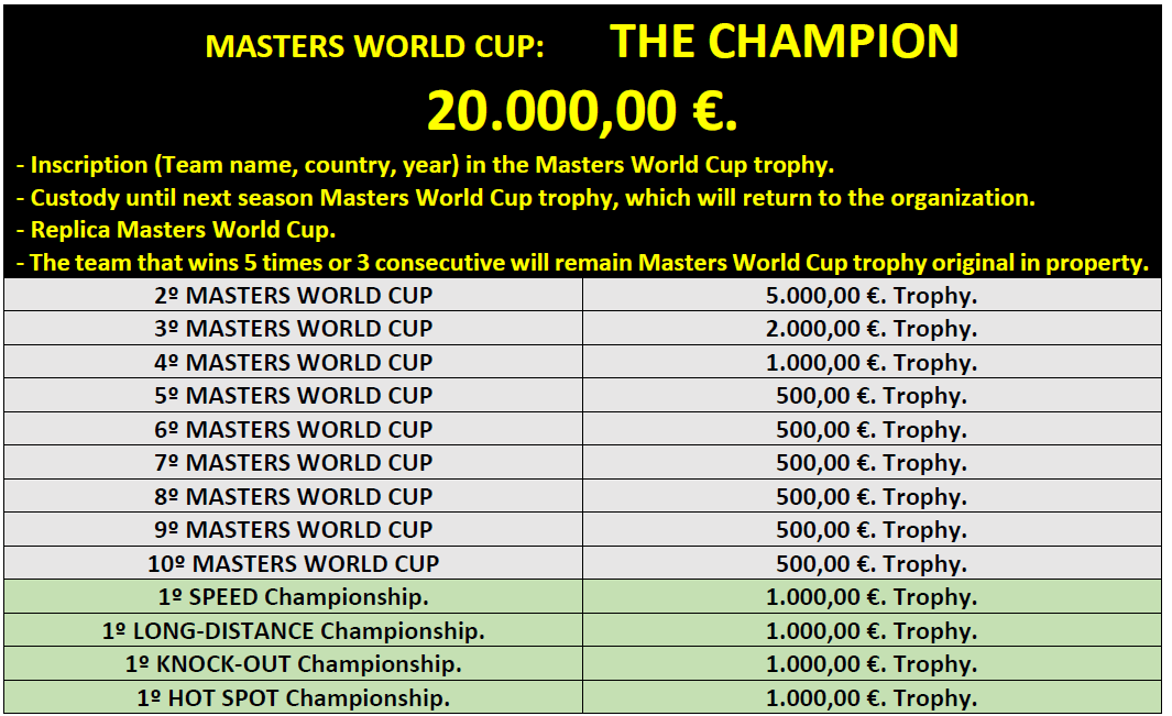 - MASTERS WORLD CUP: It is the main competition; All scoring races (16). 100 teams ranking resulting from the sum of kilometers flown in the 16 scoring races. In case of a tie kilometers (highly likely), the tie will be the sum of the times of the 16 scoring races.