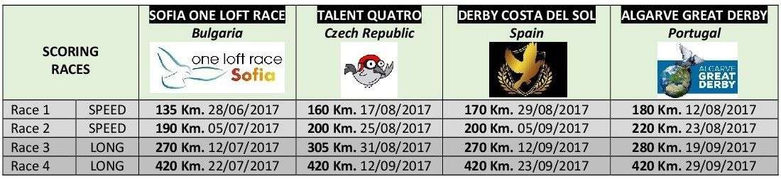 - SPEED Championship: 8 scoring races (Races 1 and 2 of each One Loft Race). 100 teams ranking resulting from the sum of kilometers flown in the 8 scoring races. In case of a tie kilometers (highly likely), the tie will be the sum of the times of the 8 scoring races.