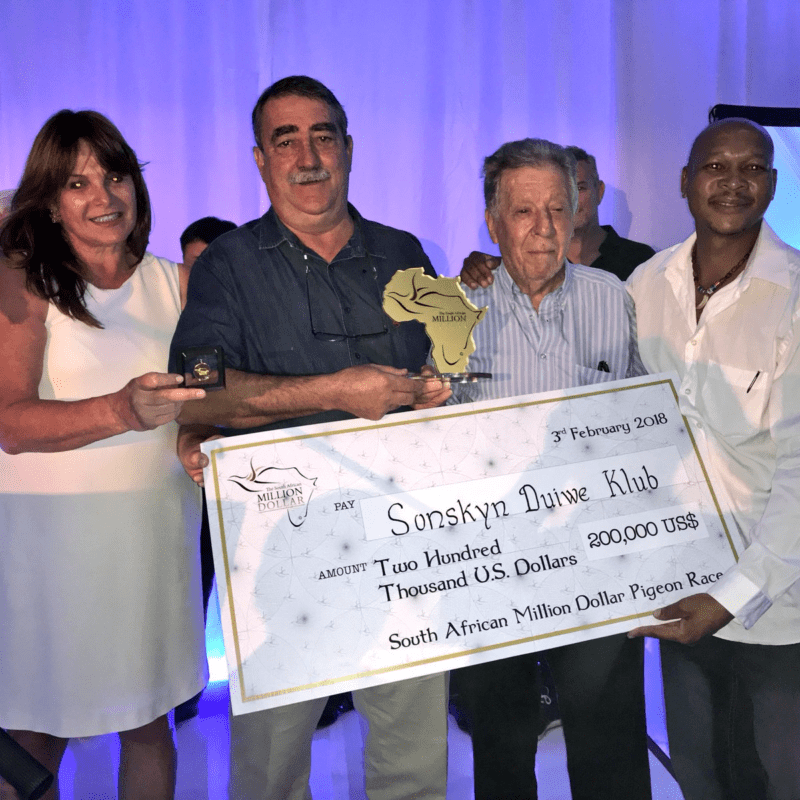 This pigeon was well clear and won the race by a clear seventeen and a half minutes. Plus, this outstanding pigeon then sold for an amazing 1.150,000 MILLION RAND, or US$94,728.17c, or £68,987, or E77,860 when it was auctioned. Mike Ganus from the Ganus Family Loft in United States of America purchased this great pigeon to add to his great Breeding Stud which of course contains many past winners of this illustrious pigeon race. This is a record breaking price paid in South African for a South African bred and rung pigeon and also the highest price paid for a SAMDPR pigeon in South Africa, the only SAMDPR pigeon to sell for more than this was Mike Ganus’s own 2016 winning pigeon Laura Is A Big Winner Today which sold in USA for US$100,010.00c, this pigeon was also purchased by Mike Ganus. Then 2nd Open Al-Watri Lofts from Kuwait with pigeon named Watri 2 bred by Fahad Al-Watri, which was officially clocked at 14.33.03.00, winning a GOLD MEDAL, Trophy and US$125,000 (£96,154), 3rd Open Neighbourhood Bullies from United States of America with pigeon named Kleine Blue bred by Bobby Brown which was officially clocked at 14.35.42.18, winning a GOLD MEDAL, Trophy and US$75,000 (£57,692), this pigeon also won THE KNOCKOUT COMPETITION and 2nd in THE OVERALL AVERAGES, 4th Open Ahmed S Al-Juwaisri from Kuwait with pigeon named Saad bred by Ahmed S Al-Juwaisri, winning GOLD MEDAL, Trophy and US$50,000 (£38,462), this pigeon was officially clocked at 14.35.52.68, 5th Open Donnelly & Kirkwood from Ireland with pigeon named Junior 2 bred by Karl Donnelly winning a GOLD MEDAL, Trophy and US$35,000 (£26,923), this pigeon was officially clocked at 14.35.52.68, this pigeon also won THE ZANDY MEYER MEMORIAL CAR NOMINATION & US$74,800 (£57,539), 6th Open F+J Vandenheede from China with pigeon named Flaterwater bred by F+J Vandenheede winning a GOLD MEDAL, Trophy and US$20,000 (£15,385), this pigeon was officially clocked at 14.40.53.23, 7th Open Irish Syndicate from United States of America with pigeon named Niall bred by Stephen Furlonge winning a GOLD MEDAL, Trophy and US$17,500 (£13,615), this pigeon was officially clocked at 14.47.35.35, this pigeon also won 5th in THE OVERALL AVERAGES, 8th Open Triple J Lofts from South Africa with pigeon named Celest bred by Jurie Eurie & Son winning a GOLD MEDAL, Trophy and US$15,000 (£11,538), this pigeon was officially clocked at 14.55.07.52, 9th Open Erwin u Ralf Schuermann from Germany with pigeon named Foxi bred by Manfred Schmidt + Martina Bau winning a GOLD MEDAL, Trophy and US$12,500 (£9,615), this pigeon was officially clocked at 14.55.21.38, 10th Open Millys Loft from United Kingdom with pigeon named Dundees Got Ya bred by Michael Mellor winning a GOLD MEDAL, Trophy and US$10,000 (£7,692), this pigeon was officially clocked at 14.55.23.07. We then had 11th Open Club Benoni Homing Society from South Africa with pigeon named Jetstream bred by Gert de Necker & Joe Gomes winning US$7,000 (£5,385), 12th Open Crazy Luck Syndicate from Germany with pigeon named Push Your Sister bred by Raimund Roidi winning US$7,000 (£5,385), 13th Open FW Munnik from South Africa with pigeon named Black 1 bred by FW Munnik winning US$7,000 (£5,385), 14th Open Veenstra – Hsu Ho Chen from Netherlands with pigeon named Return Flojo bred by Pieter Veenstra winning US$7,000 (£5,385), this pigeon also won 1st in THE OVERALL AVERAGES, this pigeon actually won this category by two hours fifteen minutes and 45.63 seconds, 15th Open Team Brodo from Germany with pigeon named Turtel bred by Juergen Brocksch winning US$7,000 (£5,385), 16th Open Paul Smith Syndicate from United Kingdom with pigeon named Stansted Blue Rocket bred by Jimmy Richards winning US$5,000 (£3,846), Next A DEFAULTER PIGEON which was not paid for by its owner, 17th Open Volker Graser from Germany with pigeon named Jonas B bred by Volker Graser winning US$5,000 (£3,846), 18th Open David Demko from United States of America with pigeon named 972Laureaat-054Cahors 120 bred by David Demko winning US$5,000 (£3,846), 19th Open TadT from Kingdom with pigeon named Wonder Girl bred by Tad Truszkowski and Vince Crossley winning US$5,000 (£3,846), this pigeon also won 7th in THE OVERALL AVERAGES, 20th Open Quest Syndicate from United States of America with pigeon named Campino bred by Philip Robertson winning US$5,000 (£3,846), 21st Open Si Se Puede Farm from United States of America with pigeon named BMW x22 bred by Robert Martin winning US$3,500 (£2,692), 22nd Open Gaddin Brothers + Charl Stander from South Africa with pigeon named Amerios 1 bred by Gaddin Brothers + Charl Stander winning US$3,500 (£2,692), 23rd Open Ludovicus Van De Wouwer from Belgium with pigeon named Louise 9 bred by Ludovicus Van De Wouwer winning US$3,500 (£2,692), 24th Open Team Hanne + Hansi Platte from Germany with pigeon named Fritzi bred by A. Wolf winning US$3,500 (£2,692), this pigeon also won 3rd in THE OVERALL AVERAGES and 25th Open Gert De Necker + Joe Gomes from South Africa with pigeon named Juliana bred by Gert De Necker + Joe Gomes winning US$3,500 (£2,692). For full result please log on to the official SAMDPR Website www.samdpr.com where you can see what time all the pigeons were officially clocked and what they all won. There were 300 cash prizes so that means another 275 cash prizes were up for grabs. I would love to list all 300 winners but unfortunately, limited space does not allow this to happen. Only 93 pigeons were officially clocked on the day up to 19.27 and 6 of these were NON-ACTIVATED PIGEONS or DEFAULTER PIGEONS so that left 213 cash prizes to won on Sunday morning. Three pigeons were clocked during the darkness at 01.37, 01.59 and 02.05. The first pigeon being clocked at 05.21.28.72 on the Sunday morning and the 300th at 08.11.26.89. There were 7 different countries in the top 10. The top 25 pigeons had 9 different countries represented in this result and then a total of 13 different countries were re